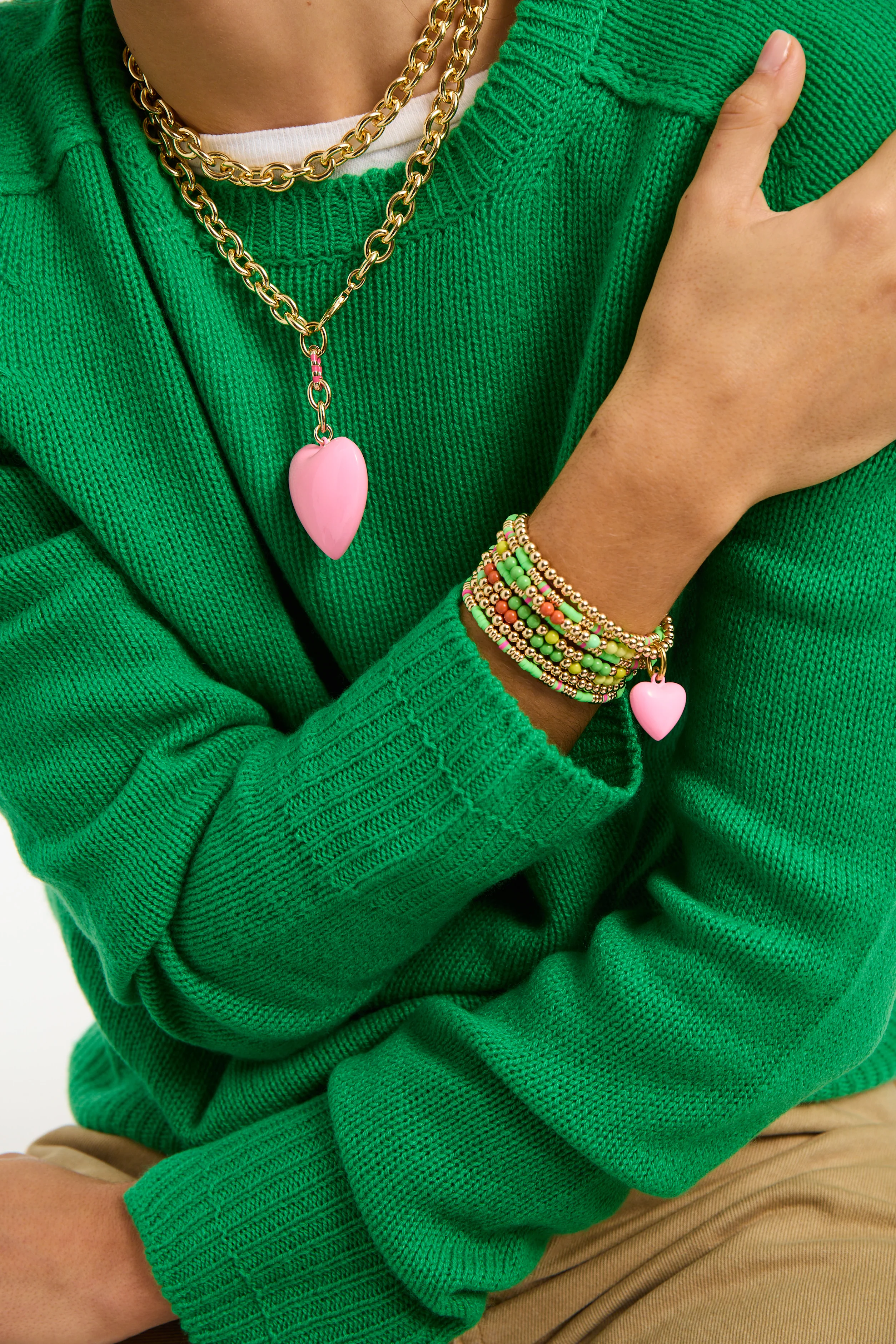 Set of six gold tone, enamel, and heishi beaded stretch bracelets
