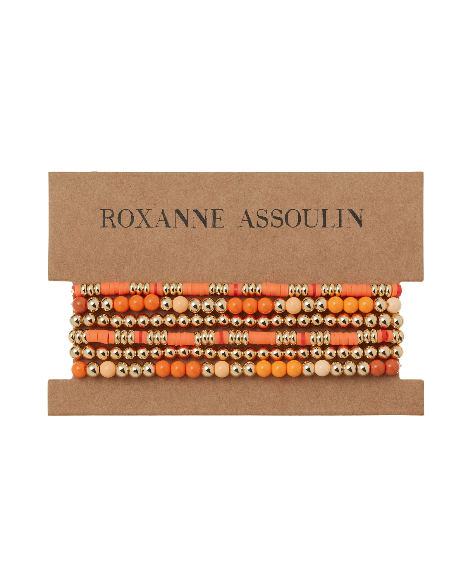 Set of six gold tone, enamel, and heishi beaded stretch bracelets