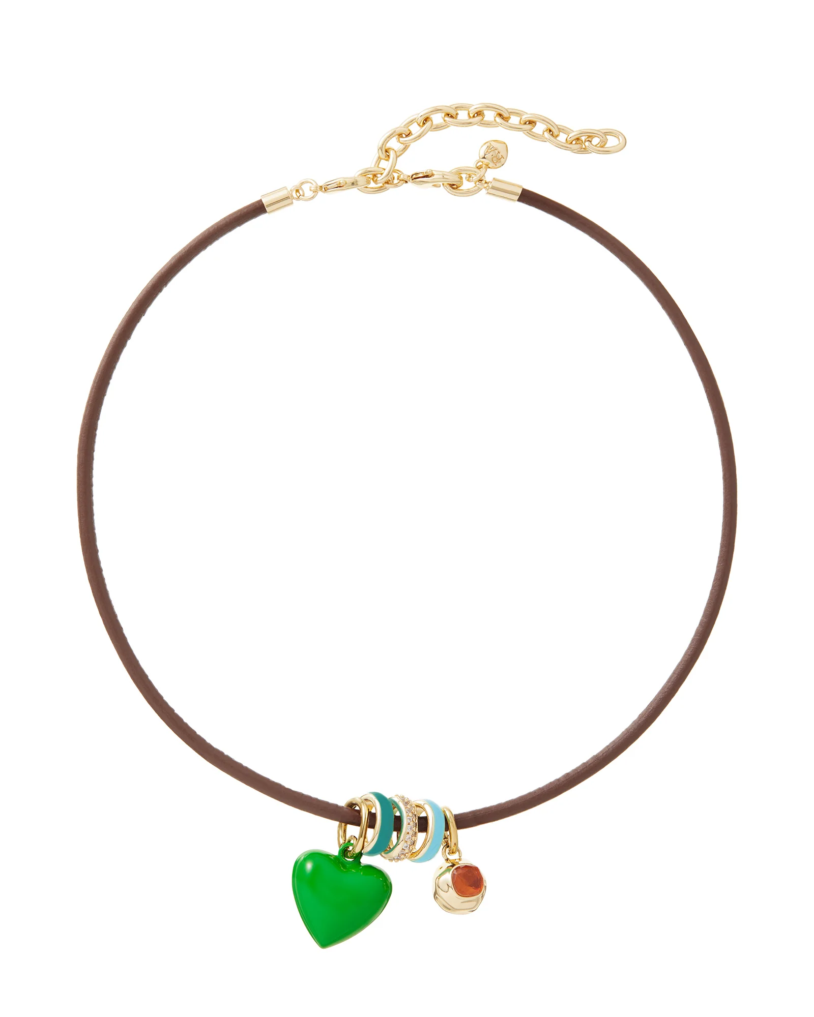Glass stone drop pendant and pave and enamel ring slider charms on a brown leather cord