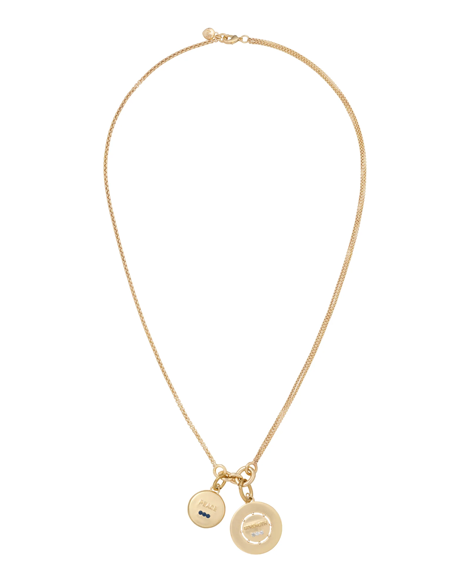 - Blue crystal shield medallion charm reads “PEACE” on the back