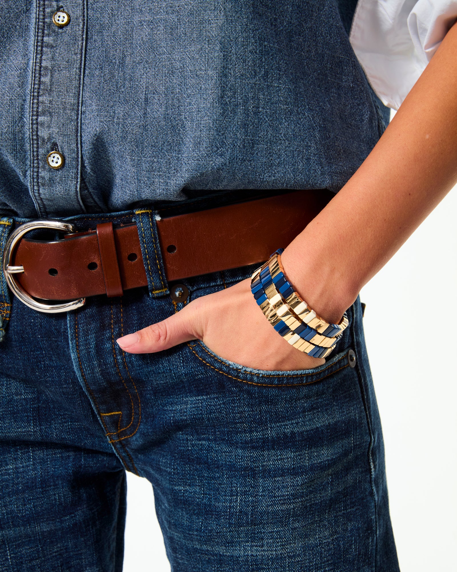 Black, navy, ivory and gold tone stretch enamel bracelet